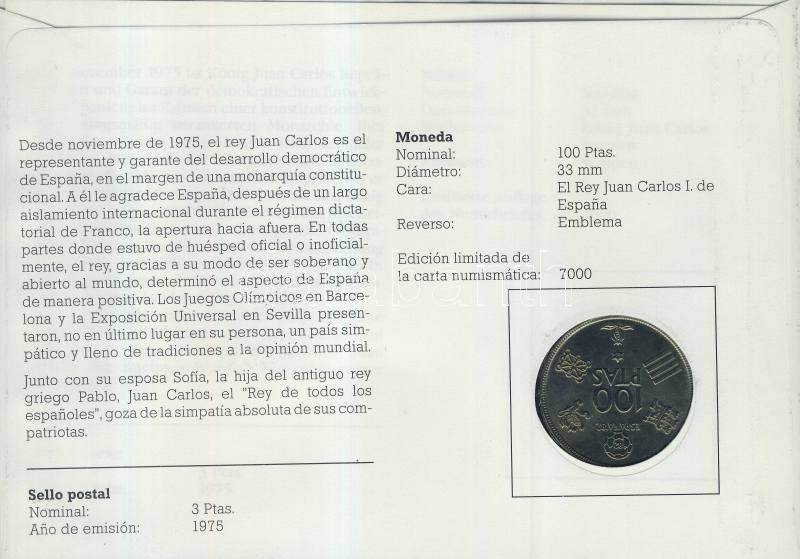 Beschreibung: Spanyolország 1980. 100P "I. Juan Carlos" bélyeges érmés borítékon, alkalmi bélyegzővel T:1 hátoldali ismertető tanúsítvánnyal Csak 7000 db!