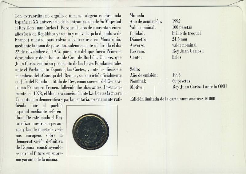 Beschreibung: Spanyolország 1995. 100P "I. Juan Carlos" bélyeges érmés borítékon T:1 hátoldali ismertető tanúsítvánnyal Csak 10.000 db!