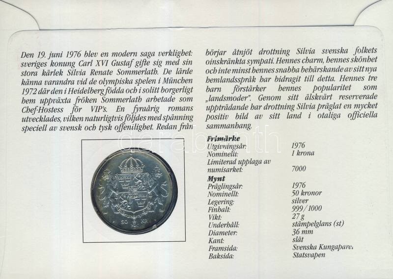 Beschreibung: Svédország 1976. 50K Ag "Szilvia és Károly" bélyeges érmés borítékon T:1 hátoldali ismertető tanúsítvánnyal Csak 7000 db!
