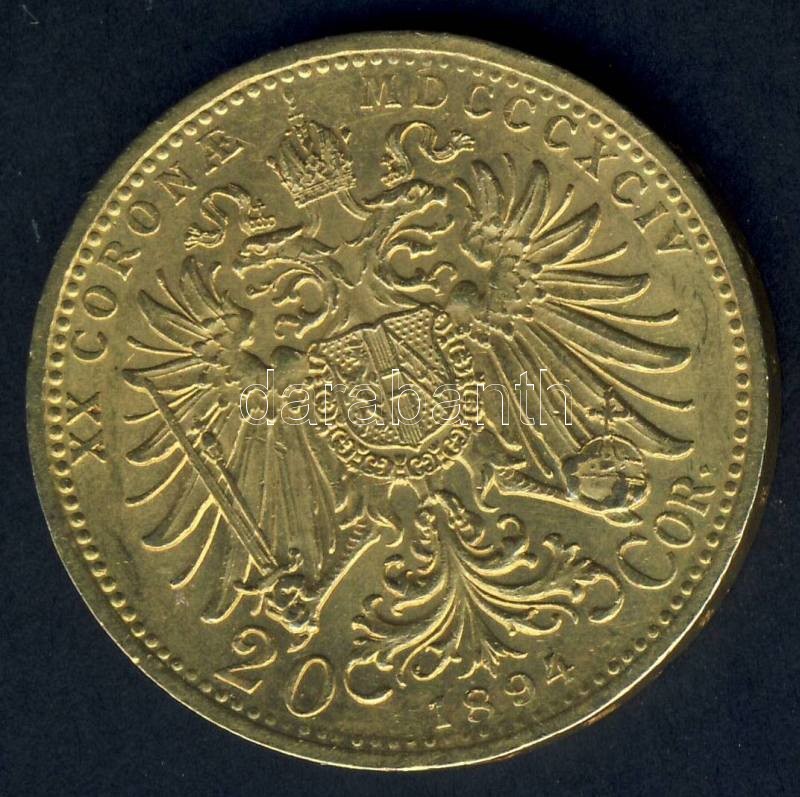 Ausztria 1894. 20K Au 6,775g T:2 ph. https://www.darabanth.com/de/109-Fernauktion/109.0/Numismatik/~374/Ausztria-1894-20K-Au-6-775g-T2-ph~II272203