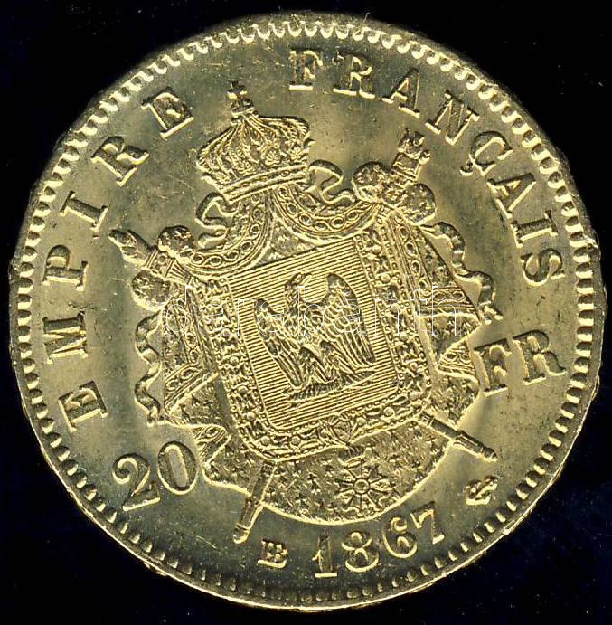 Franciaország 1867. 20Fr Au 6,4516g III.Napóleon T:2 kis ph. Tanúsítvá... https://www.darabanth.com/de/109-Fernauktion/109.0/Numismatik/~374/Franciaorszag-1867-20Fr-Au-6-4516g-IIINapoleon-T2-kis-ph-Tanusitvannyal~II273677