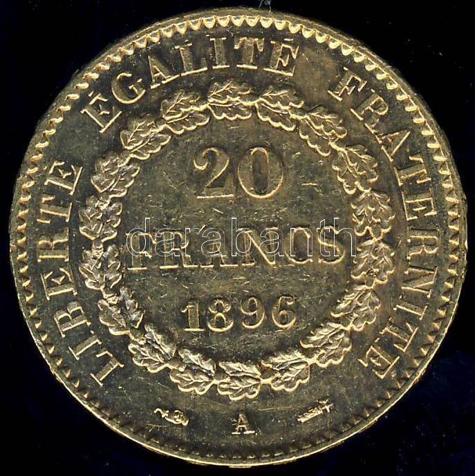 Franciaország/Köztársaság 1896A 20Fr Au 6,4516g T:2/3 kis ph. https://www.darabanth.com/de/109-Fernauktion/109.0/Numismatik/~374/FranciaorszagKoztarsasag-1896A-20Fr-Au-6-4516g-T23-kis-ph~II273680