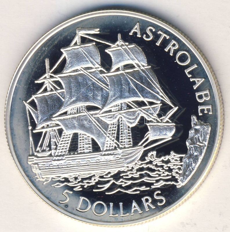 Beschreibung: Cook szigetek 1992. 5$ Ag "Astrolabe vitorláshajó" T:PP