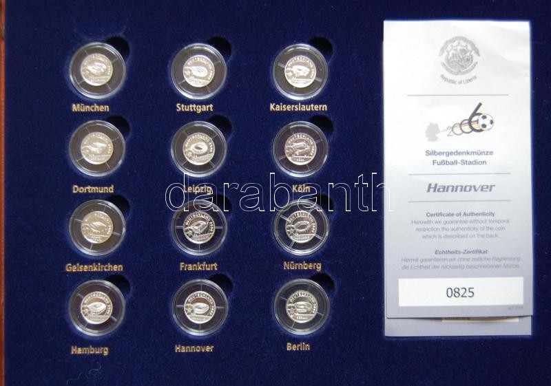Beschreibung: Libéria 2004. 1$ Ag "Labdarúgó VB-Németország" 12klf db érme, komplett sor T:PP Díszdobozban, tanúsítvánnyal!