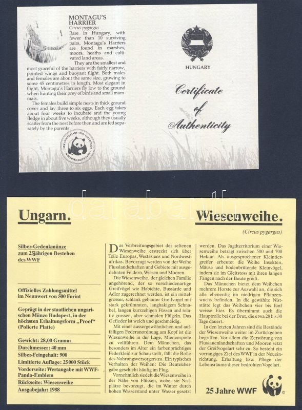 Beschreibung: 1988. 500Ft Ag "Világ vadvédelmi alap" WWF által kiadott emléklapon, tanúsítvánnyal T:PP