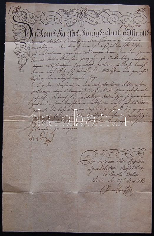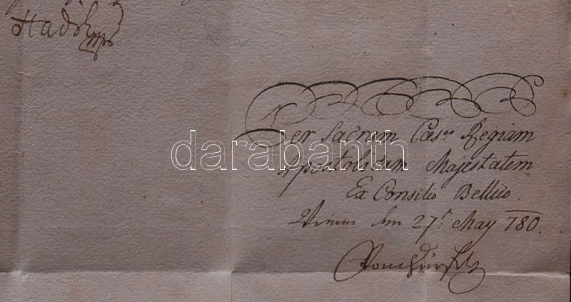 1790 gróf Hadik András tábornok, helytartótanácsi elnök levele, saját kezű aláírásával, két főtiszt (Mecklenburg vezérőrnagy , Wollminger lovassági százados) anyagi ügyeiről / Letter with autograph signature of count Andras Hadik general, president of the Governing Council. About financial matters of two high officers of the army