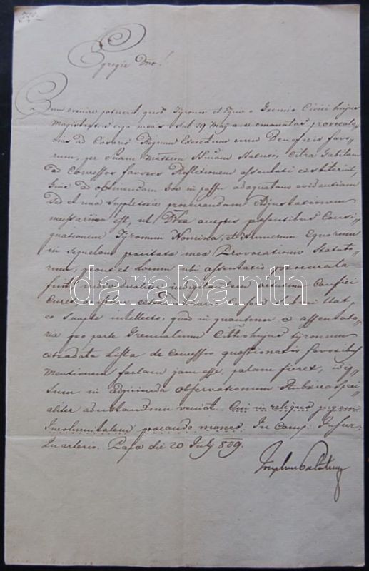Beschreibung: 1809 Nádori ex offo levél József nádor saját kezű aláírásával / Ex offo letter of the Palladin`s office with autograph signature of Joseph Palladin