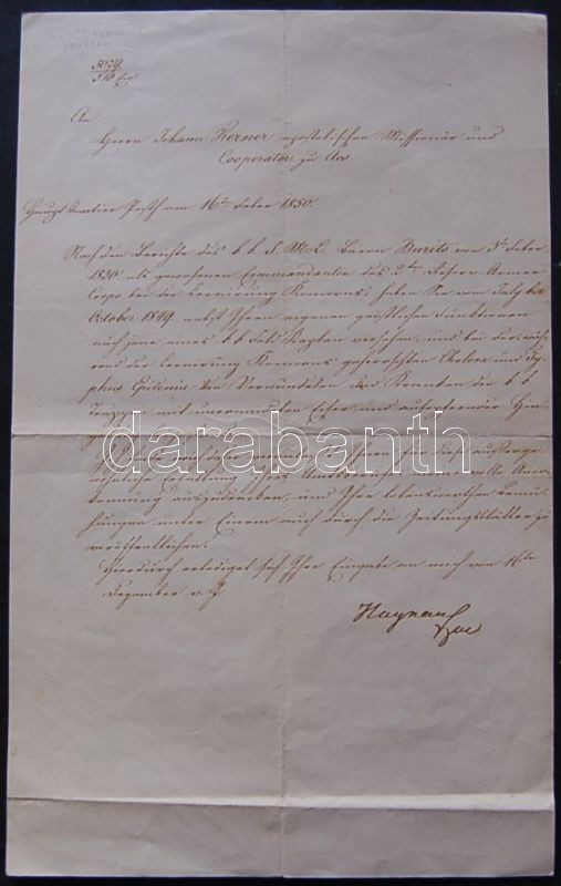 1850. december. 16. Julius Heinrich Haynau táborszernagy saját kézzel aláírt levele Johann Werner misszionárius és segédlelkésznek, az osztrák seregben a szabadságharc vége felé kitört kolera és tifusz járvány tárgyában / Letter with autograph signature of Julius Heinrich Haynau concerning the colera and typhus epidemic broke out during the 1848/49 revolution. Addressed to Johan Werner missionare. 22x35 cm