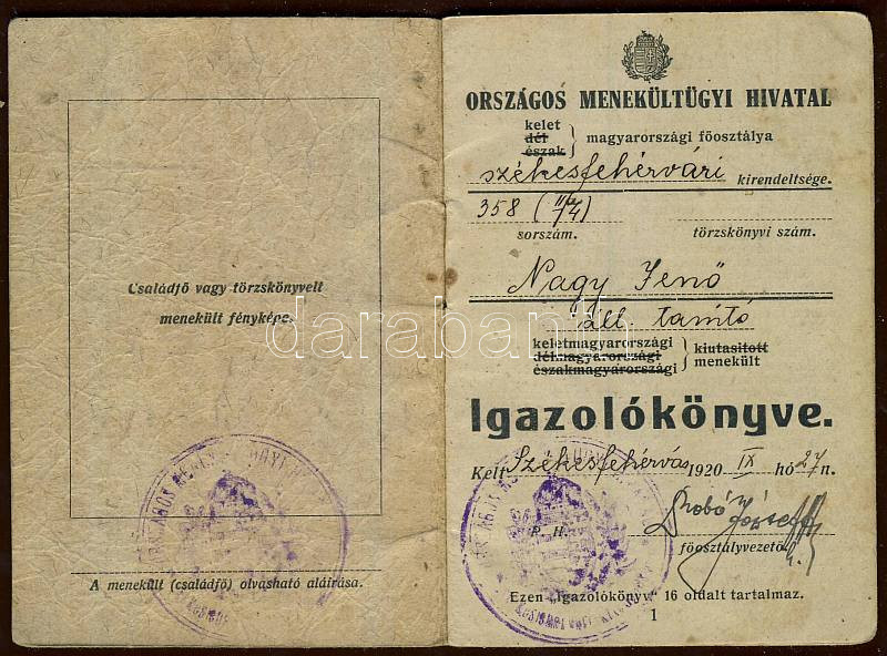 1920 Orsz. Menekültügyi Hivatal kitöltött igazolókönyv https://www.darabanth.com/de/110-Fernauktion/110.0/Andere-Sammelgebiete/~299/1920-Orsz-Menekultugyi-Hivatal-kitoltott-igazolokonyv~II275617
