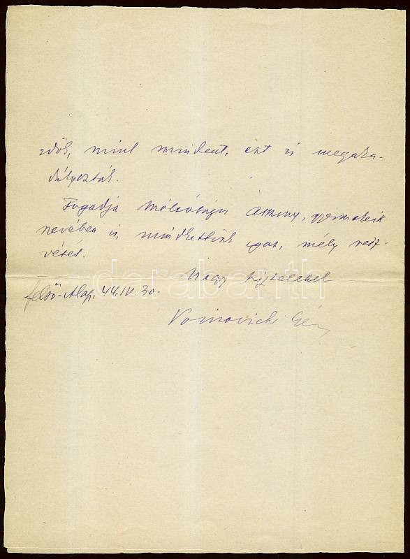 Beschreibung: 1944 Voinovich Géza irodalomtörténész és Arany János-kutató autográf levele és aláírása
