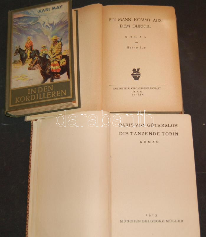 3db német nyelvű könyv, mint: 1953 Karl may: In den Kordilleren, 1913 Paris von Gütersloh die tanzende Törin illetve Heino Ide: Ein Mann kommt aus dem Dunkel, sérült állapotban