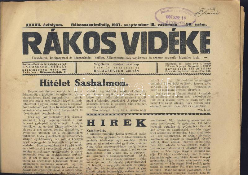 1937 Rákos vidéke újság szeptemberi száma https://www.darabanth.com/de/110-Fernauktion/110.0/Andere-Sammelgebiete/~309/1937-Rakos-videke-ujsag-szeptemberi-szama~II275369