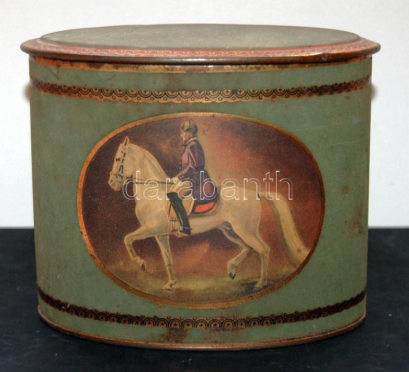 Beschreibung: Antik díszes kávésdoboz a múlt század derekáról, lovas grafikával és 13cm-es magassággal