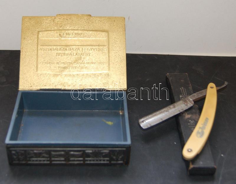 Beschreibung: Enyhén rozsdás állapotban lévő régi borotva, mellé pedig egy fém dobozka, emlékül a haza fegyveres szolgálatáért felirattal