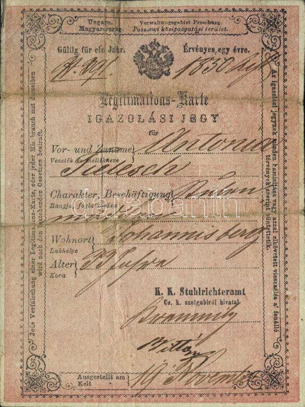 1858 Személyazonosító igazolvány 12 kr okmnybélyeggel / ID card with 1... https://www.darabanth.com/de/111-Fernauktion/111.0/Andere-Sammelgebiete/~1000061/1858-Szemelyazonosito-igazolvany-12-kr-okmnybelyeggel-ID-card-with-12-kr-document-stamp~II278567