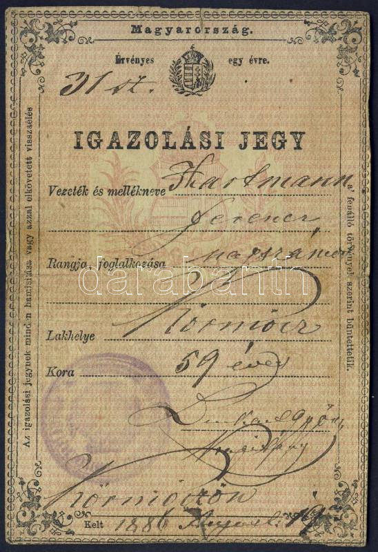 Beschreibung: 1886 Személyi igazolvány Körmöcbányán kiállítva 15 kr okménybélyeggel / ID card issued in Kremnica