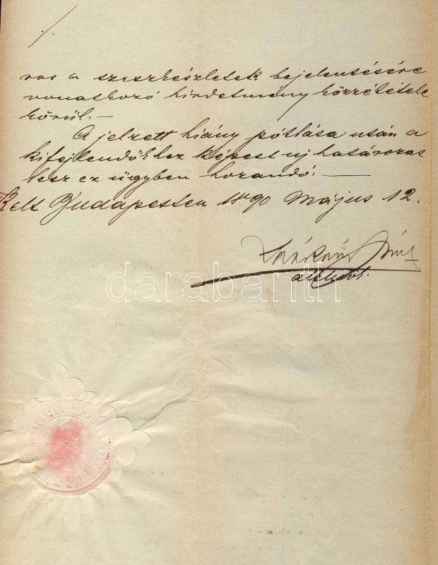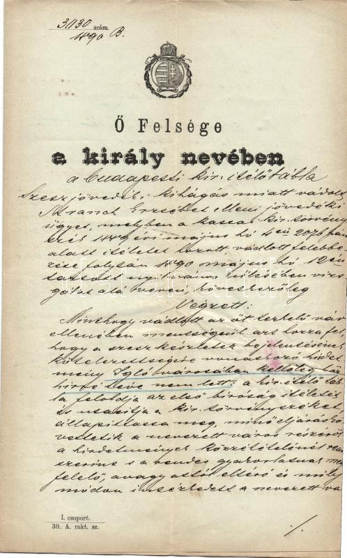 Beschreibung: 1890 Érdekes ítélet szesz ügyben az ítélőtábla alelnökének aláírásával
