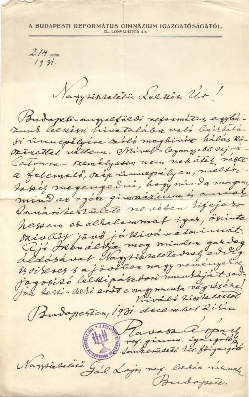 Beschreibung: 1931 Ravasz Árpád tankerületi kir. főigazgató autográf levele