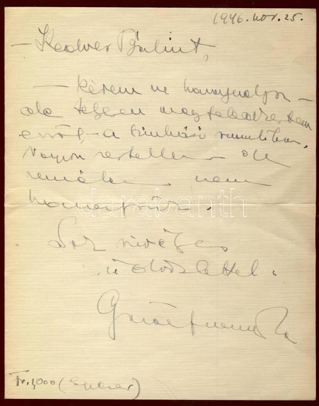 Beschreibung: 1946 Gaál Franciska színésznő saját kézzel írt és aláírt levele