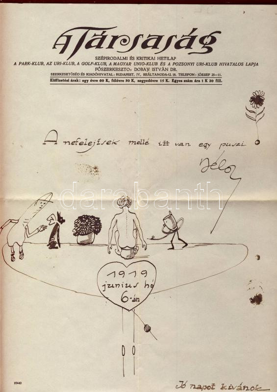 Endrődi Béla író, újságíró pajzán rajza és aláírása A Társaság c. lap ... https://www.darabanth.com/de/111-Fernauktion/111.0/Andere-Sammelgebiete/~1000062/Endrodi-Bela-iro-ujsagiro-pajzan-rajza-es-alairasa-A-Tarsasag-c-lap-fejleces-papi~II281581