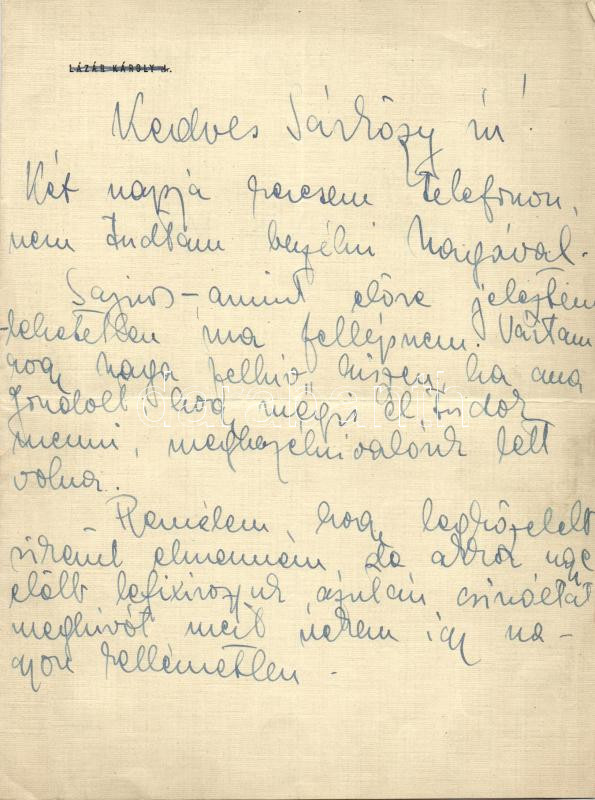 Beschreibung: Lukács Margit színésznő saját kézzel írt levele