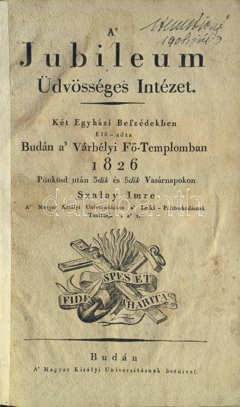 Beschreibung: 1826 Szalay Imre a Jubileum Üdvösséges Intézet előadása a budai Várbélyi Fő-Templomban, a Magyar Királyi Universitásnak betűivel