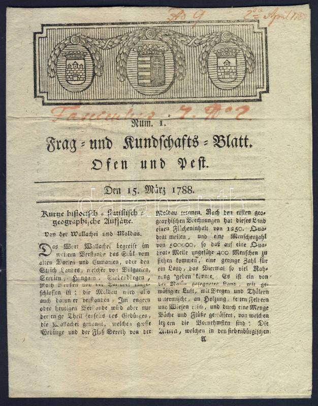 1787 Frag- und Kundschaftsblatt Ofen und Pest c. hirdetési újság márc. 15.-i száma 8 oldal benne a román történelem / Advertising paper with the history of the Romanians