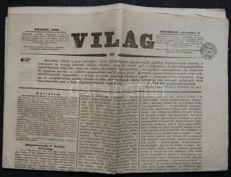1842 A Világ c. újság nov. 5.-i száma kiváló állapotban 1kr szignettáv... https://www.darabanth.com/de/111-Fernauktion/111.0/Andere-Sammelgebiete/~1000071/1842-A-Vilag-c-ujsag-nov-5-i-szama-kivalo-allapotban-1kr-szignettaval~II279225