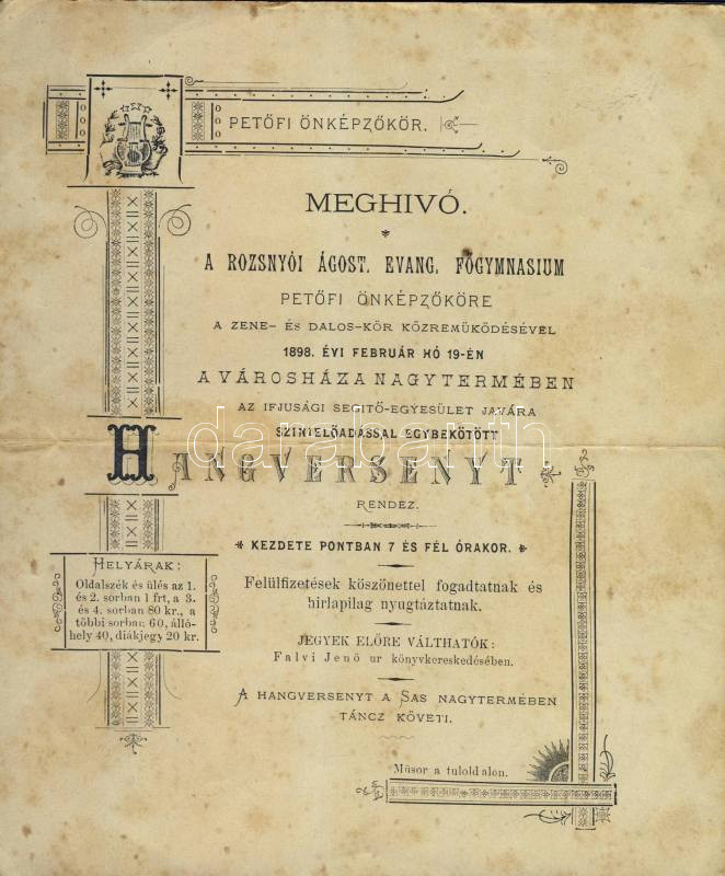 1898 A Rózsnyói gimnázium Petőfi önképző körének dekoratív meghívója 4... https://www.darabanth.com/de/111-Fernauktion/111.0/Andere-Sammelgebiete/~1000071/1898-A-Rozsnyoi-gimnazium-Petofi-onkepzo-korenek-dekorativ-meghivoja-4-old-Invitation-~II277580