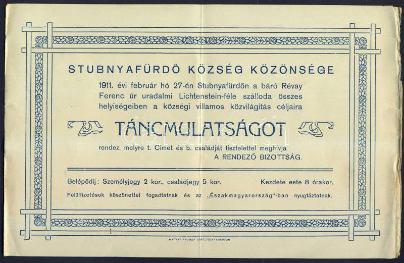 Beschreibung: 1911 Meghívó a Stubnyafürdői elektromos világítás javára rendezett estélyre / Invitation for the ball for the electric illumination of Stubnyafürdő