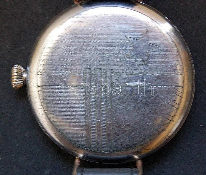 Beschreibung: Nagyméretű Sztálinos óralappal ellátott karóra, vörös-csillag gravírozással a hátlapon, működőképes állapotban