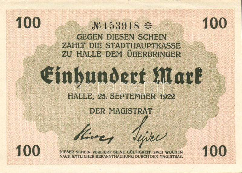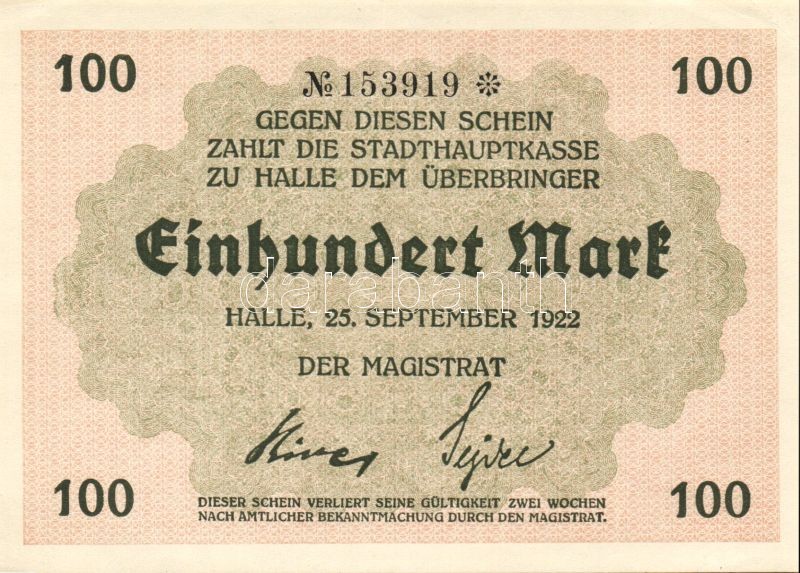 Beschreibung: Német Birodalom/Weimari Köztársaság/Halle 1922.09.25. 100M (2x) egymásutáni sorszámmal T:I,I-
