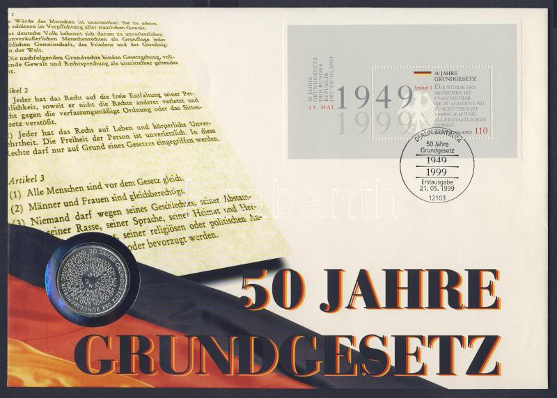 NSZK 1999. 10M Ag "50 éves Alkotmány" érmés borítékon bélyegblokkal, e... https://www.darabanth.com/de/112-Fernauktion/112.0/Numismatik/~410/NSZK-1999-10M-Ag-50-eves-Alkotmany-ermes-boritekon-belyegblokkal-elsonapi-belyegzovel-~II283720
