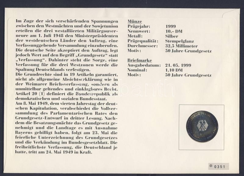 Beschreibung: NSZK 1999. 10M Ag "50 éves Alkotmány" érmés borítékon bélyegblokkal, elsőnapi bélyegzővel, hátoldali ismertető tanúsítvánnyal T:1-