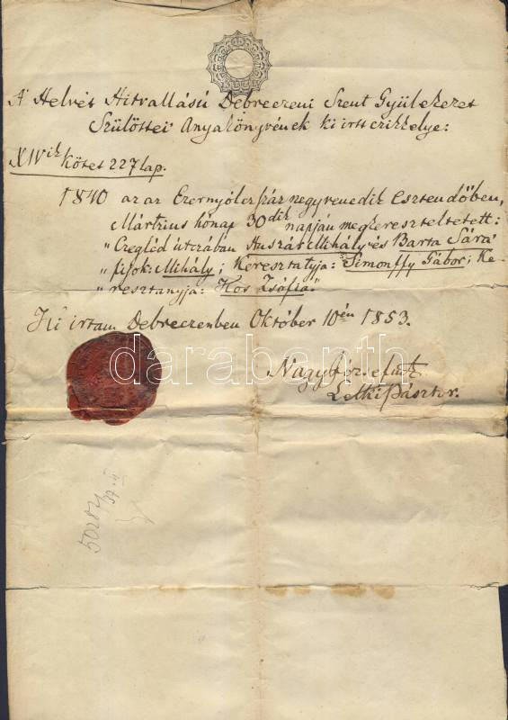 1853 október 10.-én kiállított anyakönyvi cikkely viaszpecséttel és 30... https://www.darabanth.com/de/113-Fernauktion/113.0/Andere-Sammelgebiete/~100069/1853-oktober-10-en-kiallitott-anyakonyvi-cikkely-viaszpecsettel-es-30f-es-okmanybelyeggel~II290417