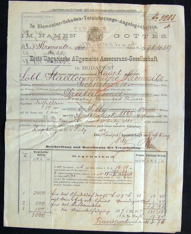 Beschreibung: 1884 Első Magyar Ált. Biztosító Rt. biztosítási kötvény / Insurance contract
