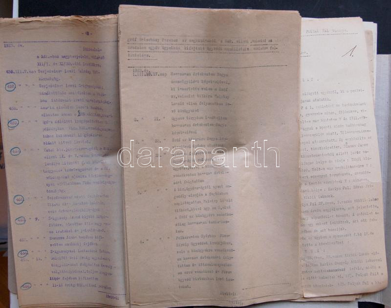 1923 gr. Eszterházy Ferenc perének vázlata, benne az ügyvéd által elvégzett és elszámolt munkák részletes felsorolásával, melyből kiviláglik a per lefolyása kb 100 oldalon, hozzá korabeli emberölési bűnügy ügyvédi iratai