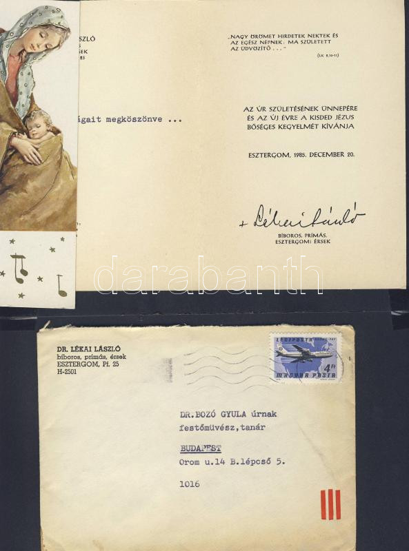 Beschreibung: 1985 Dr. Lékai László bíboros, prímás, esztergomi érsek aláírása Bozó Gyula festőművészhez írt üdvözlőkártyáján