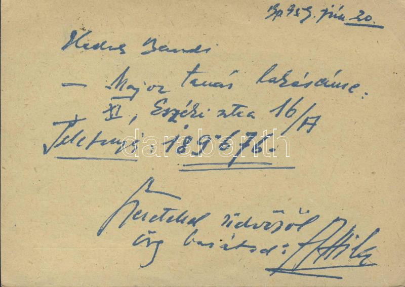 Beschreibung: Orbók Attila író, újságíró autográf levelezőlapja, aláírással