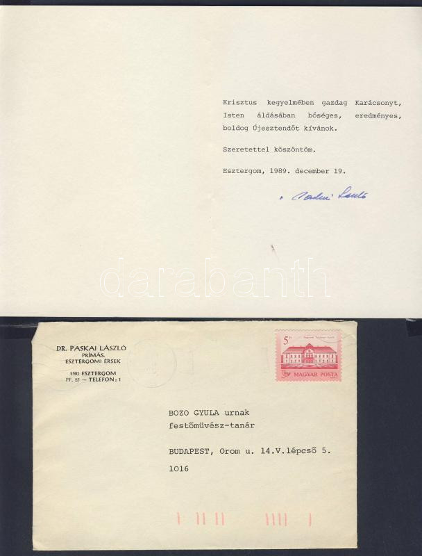 Paskai László bíboros, prímás aláírása Bozó Gyulának szóló üdvözlőlapo... https://www.darabanth.com/de/113-Fernauktion/113.0/Andere-Sammelgebiete/~100070/Paskai-Laszlo-biboros-primas-alairasa-Bozo-Gyulanak-szolo-udvozlolapon~II280391