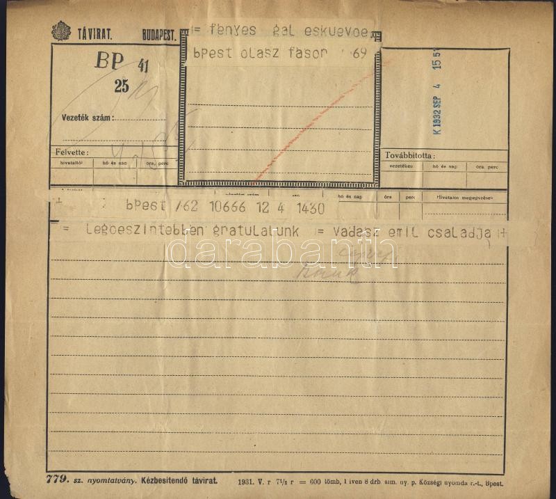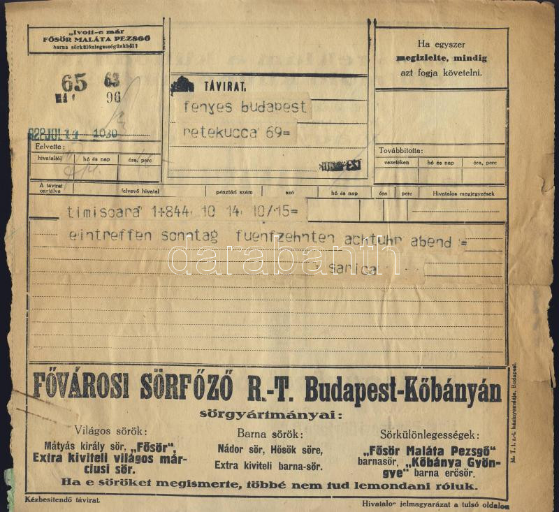 Beschreibung: cca 1930 3db sörreklámos távirat
