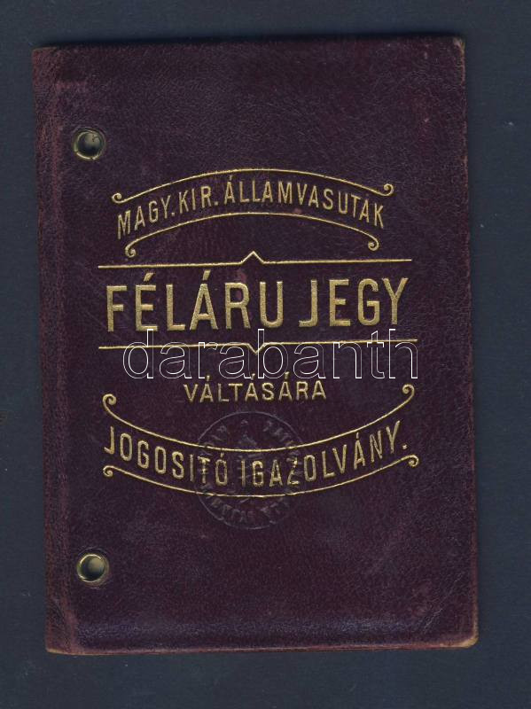 1903 Magyar Királyi Államvasutak félárú arcképes jegy igazolvány, szép... https://www.darabanth.com/de/113-Fernauktion/113.0/Andere-Sammelgebiete/~100078/1903-Magyar-Kiralyi-Allamvasutak-felaru-arckepes-jegy-igazolvany-szep-allapotban~II290453