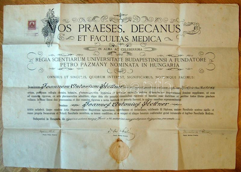 1932 Pázmány Péter Tudományegyetem által kiállított nagyalakú orvostud... https://www.darabanth.com/de/113-Fernauktion/113.0/Andere-Sammelgebiete/~100078/1932-Pazmany-Peter-Tudomanyegyetem-altal-kiallitott-nagyalaku-orvostudomanyi-oklevel-latin~II290539