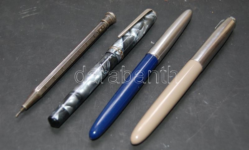 Beschreibung: Múlt század eleji alpakka ceruza, hiányos állapotban és 3db töltőtoll