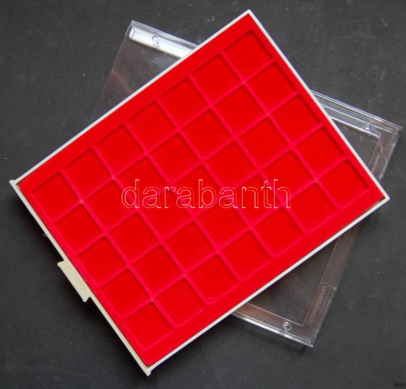 Beschreibung: Lindner éremtartó tálca, 35 férőhellyel, 36x36mm, műanyag tok kissé sérült