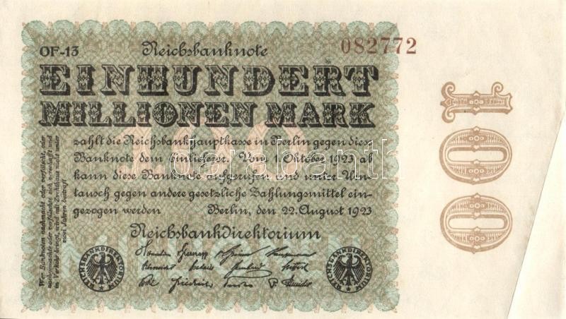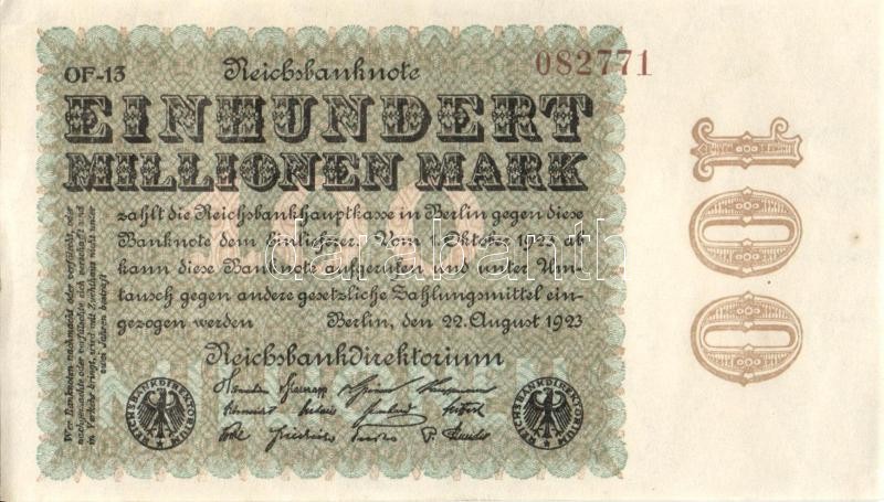 Beschreibung: Német Birodalom / Weimari Köztársaság 1923. 100.000.000M (3x) cégnyomat, egymás utáni sorszámokkal T:I,II+