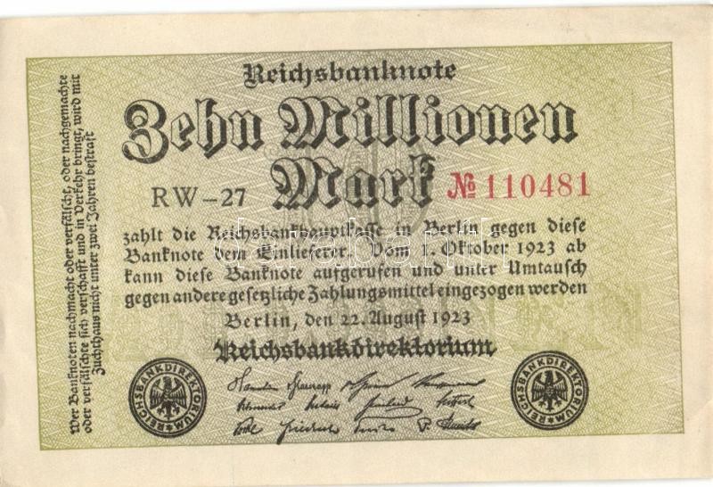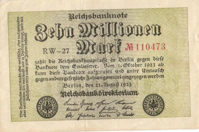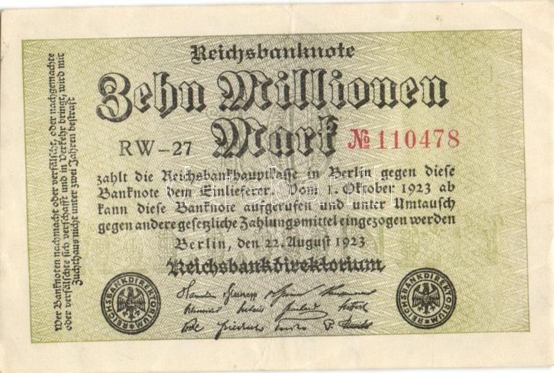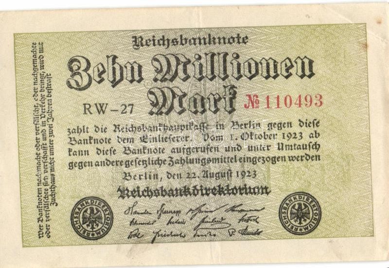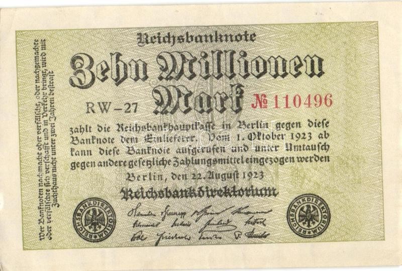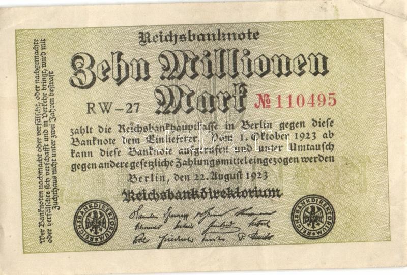 Beschreibung: Német Birodalom / Weimari Köztársaság 1923. 10.000.000M (7x) egymás utáni ill. kis ugrású sorszámokkal, vágáshibával T:I,I-,II