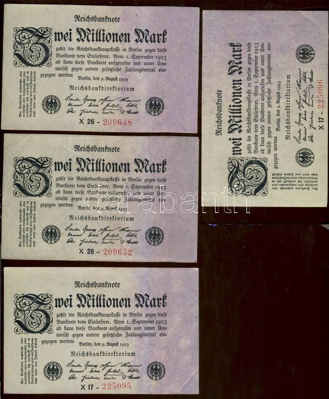 Beschreibung: Német Birodalom / Weimari Köztársaság 1923. 2.000.000M (4x) közte egymás utáni ill. kis ugrású sorszámokkal T:II+