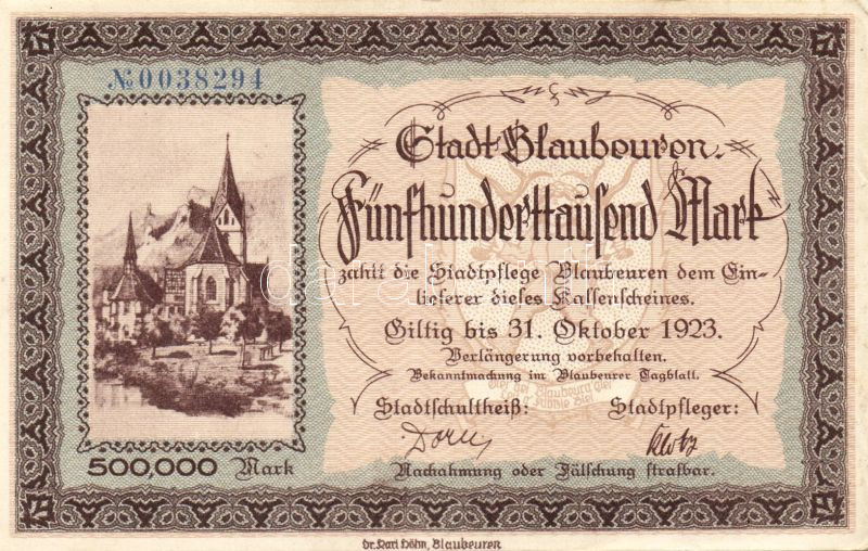 Beschreibung: Német Birodalom/Weimari Köztársaság/ Blaubeuren 1923.10.31. 500.000M T:II