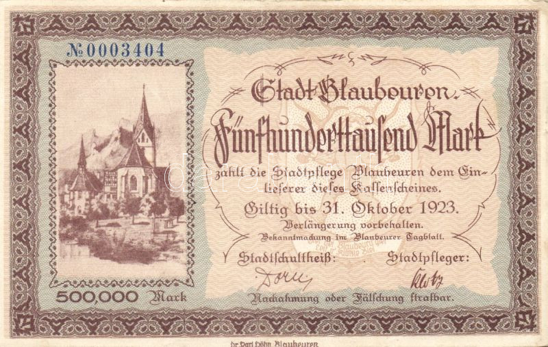 Beschreibung: Német Birodalom/Weimari Köztársaság/ Blaubeuren 1923.10.31. 500.000M T:II